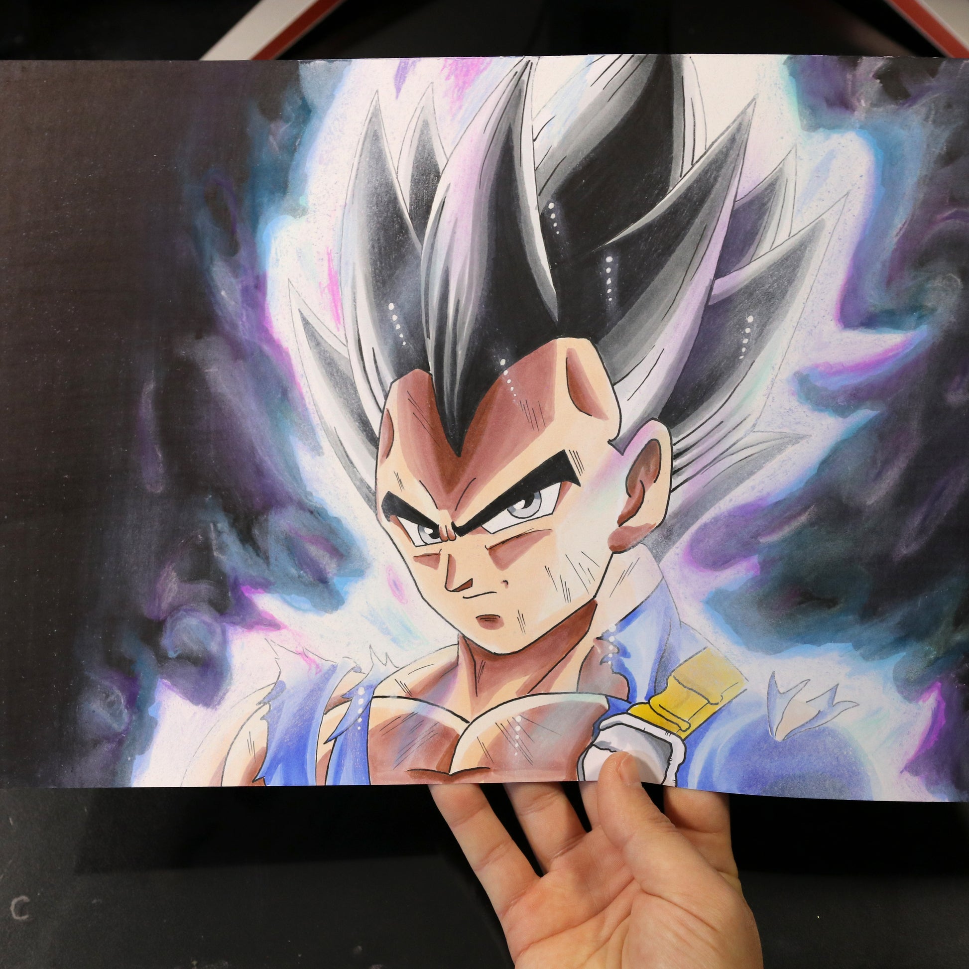 Dibujo de Vegeta Ultra Instinct realizado con marcadores base alcohol y lápices pastel.