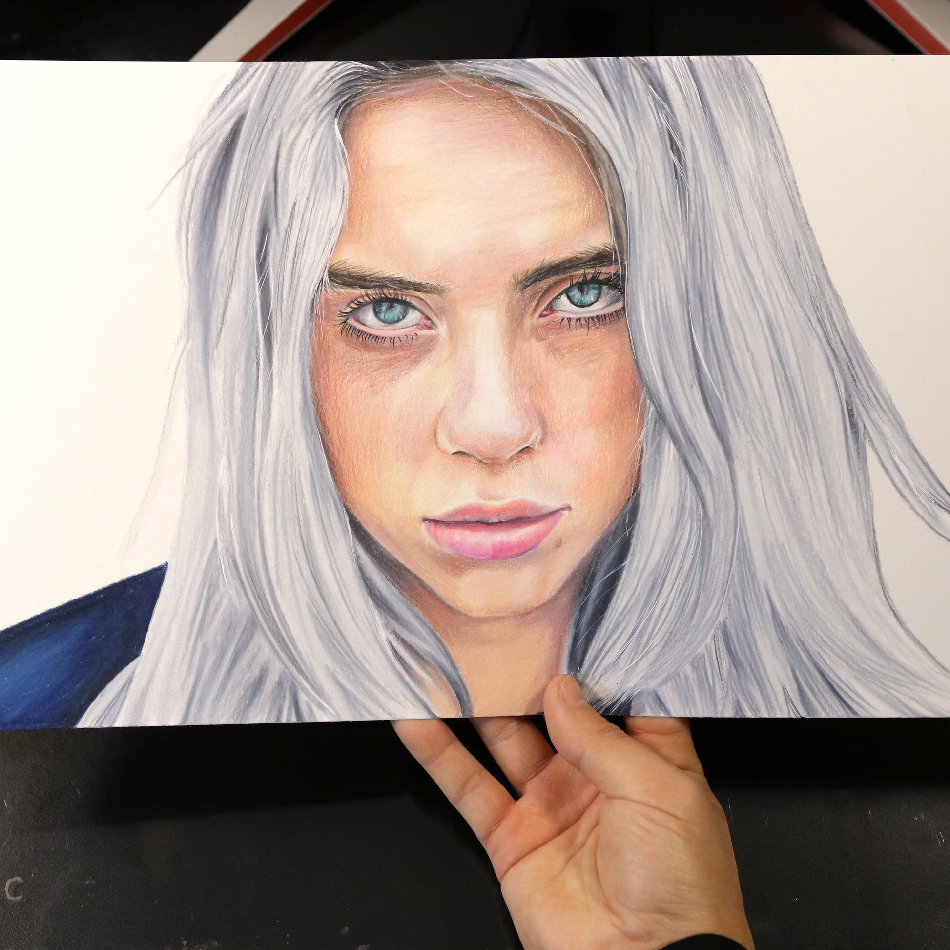 Dibujo de Billie Eilish realizado con lápices de colores caran d'ache.