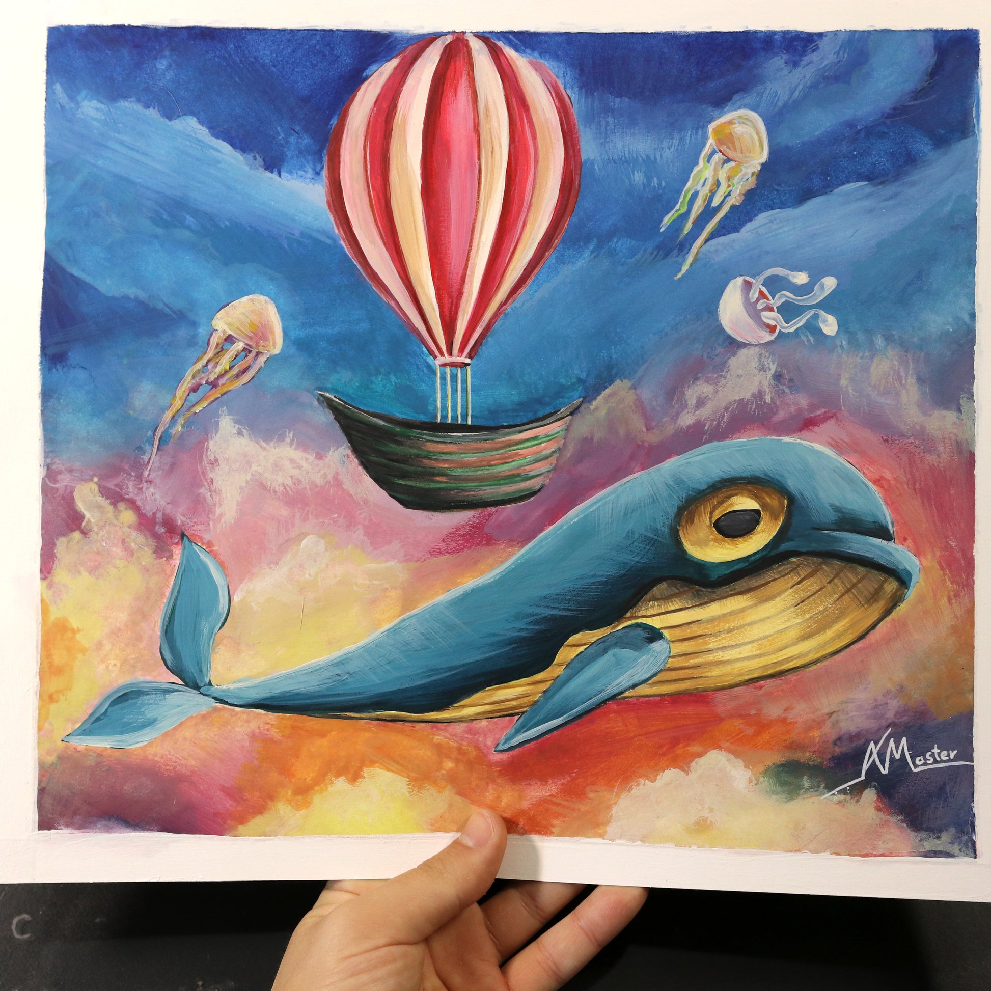 Dibujo de una Ballena psicodélica con un globo aerostático y medusas realizado a técnica de Gouache.