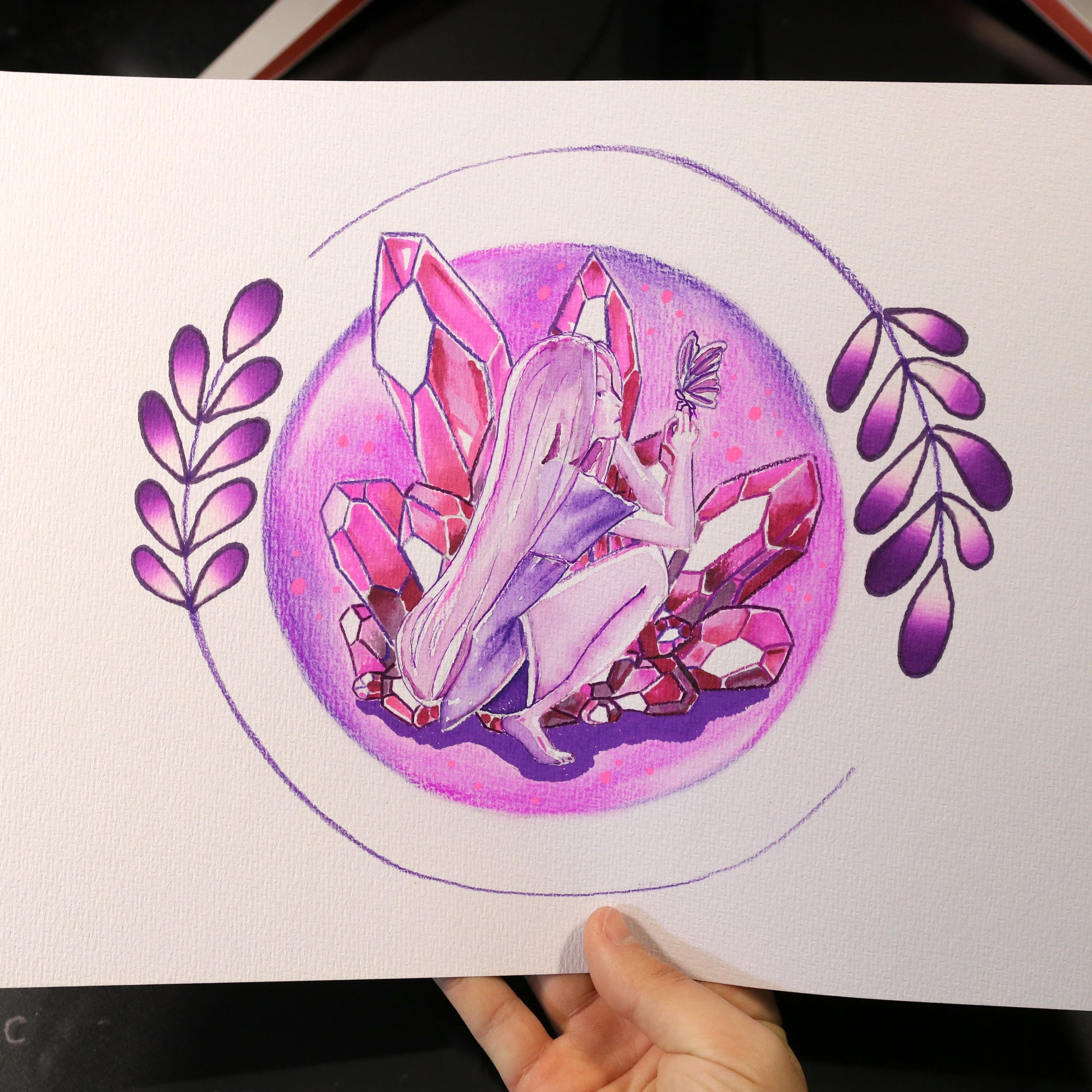 Dibujo de una chica con esmeraldas alrededor, realizado con marcadores, lápices y todo tipo de materiales en tonos violetas y rosados.
