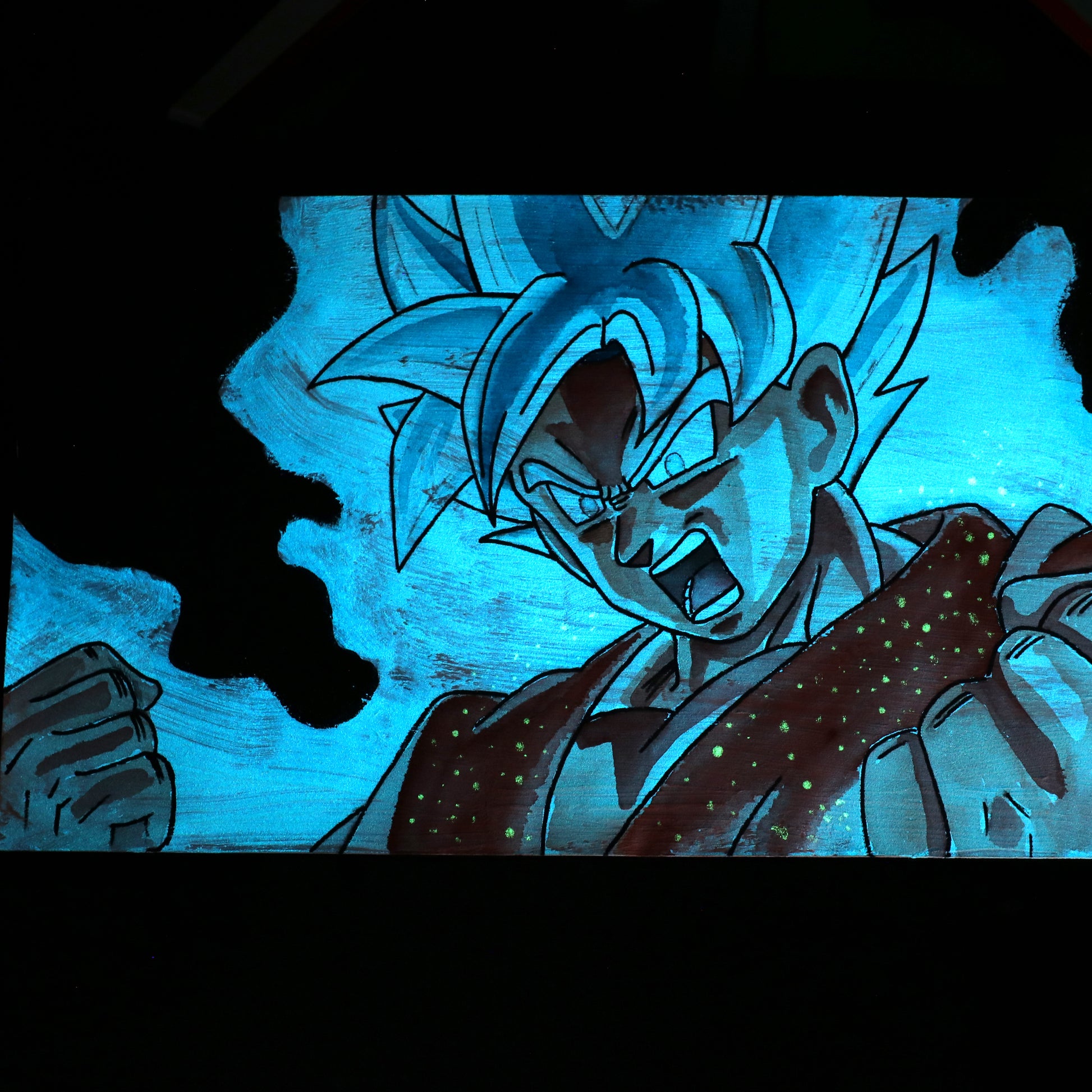 Dibujo de Goku con efecto Fotoluminiscente. Este dibujo absorbe la luz del día y mantiene su brillo con la luz apagada durante unos 20 minutos después. No es necesario usar luz ultravioleta, funciona con luz solar normal o lámpara normal.