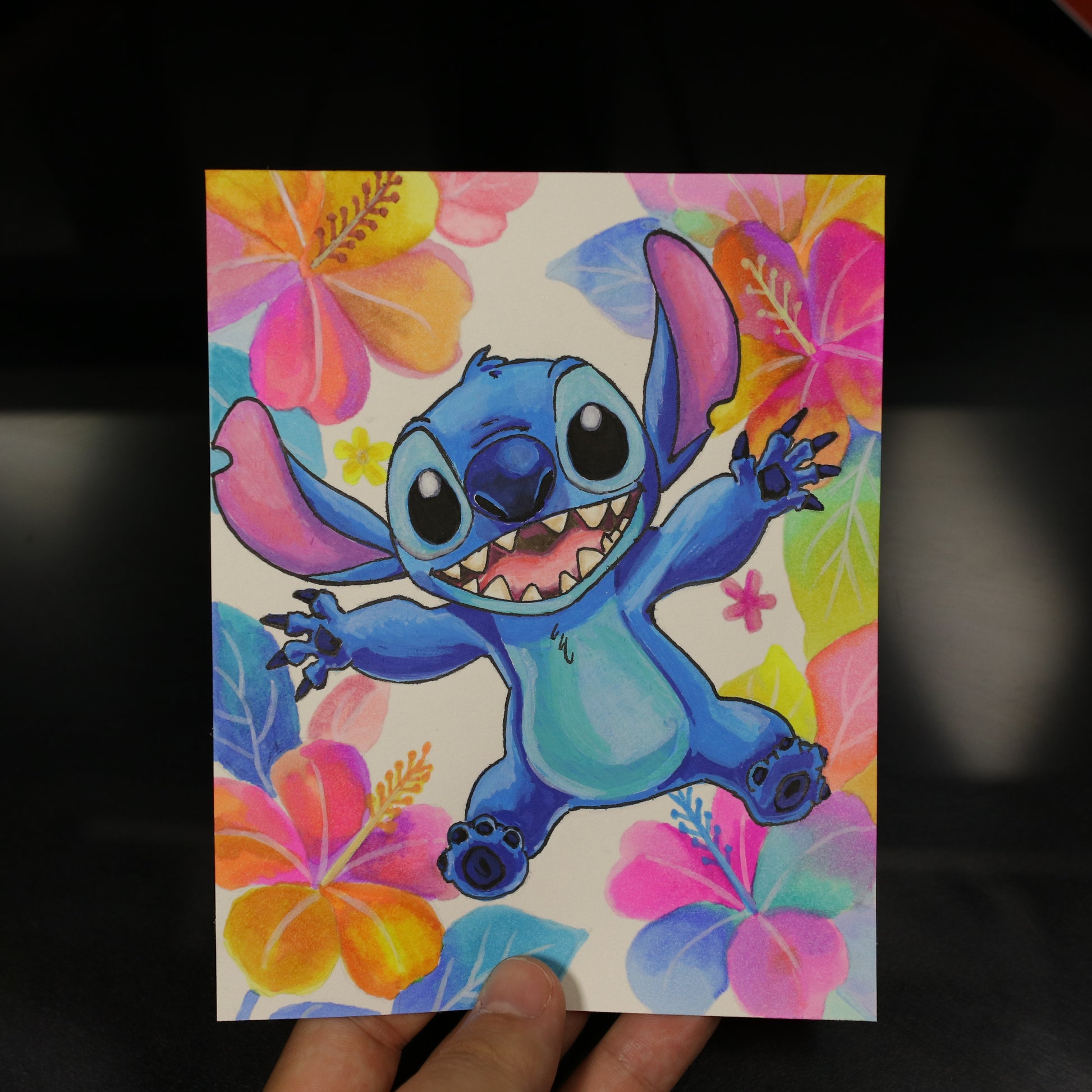 Dibujo original de Stitch con Flores), realizado con delineadores, marcadores base alcohol y marcadores acrílicos.